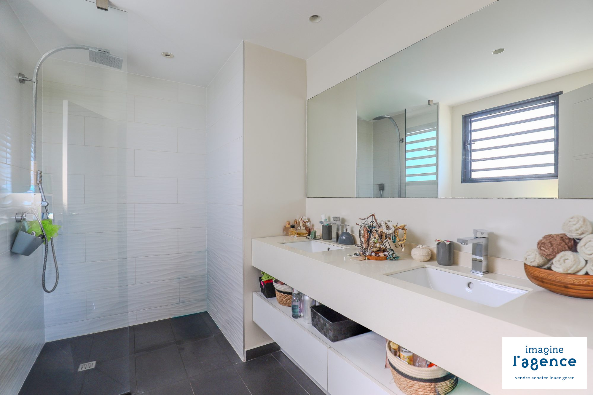 Bel F3 de deux chambres et deux salles de bain. Séjour de 40 m2 donnant sur une terrasse entièrement couverte de 22 m2 avec vue mer. Chambres climatisées. Chauffe eau solaire. 2 emplacements de parkings couverts et fermés. Résidence avec piscine et salle de sport. Emplacement idéal